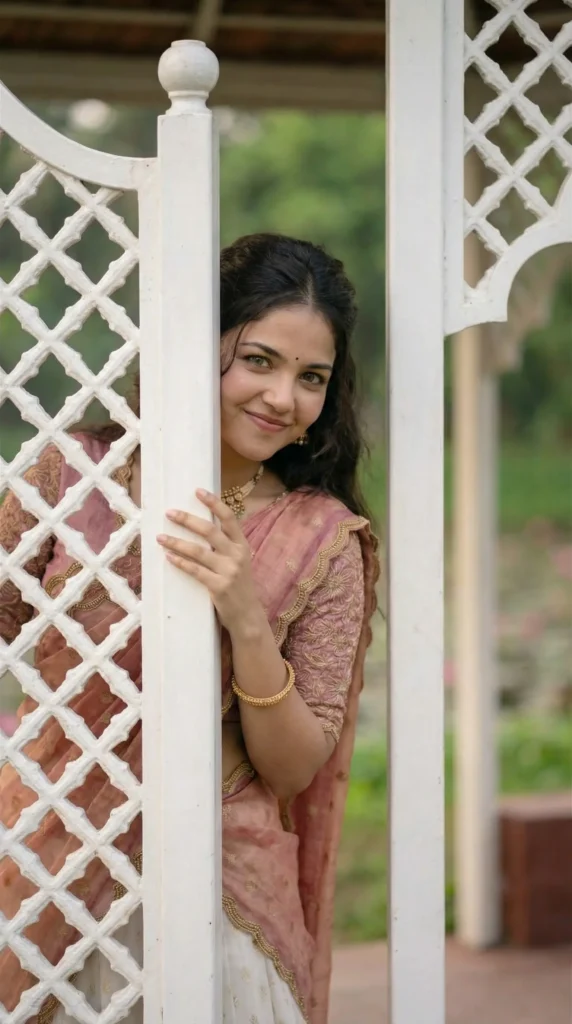 “The ‘Hide & Seek’ aesthetic. A playful and intimate waist-up portrait capturing a sweet moment of connection. She is standing inside a white ornate garden gazebo with intricate diamond latticework. She peeks playfully from behind one of the white pillars, revealing her head and shoulder while resting one hand gently on the structure. Her expression is mischievous and sweet, with a bright, sparkling closed-mouth smile and eyes looking directly at the camera. The crisp white of the gazebo contrasts beautifully with the soft pink tones of her outfit. The background is a soft, out-of-focus blur of the lush green garden. Cinematic portrait aesthetic, soft open shade lighting, shallow depth of field.”
