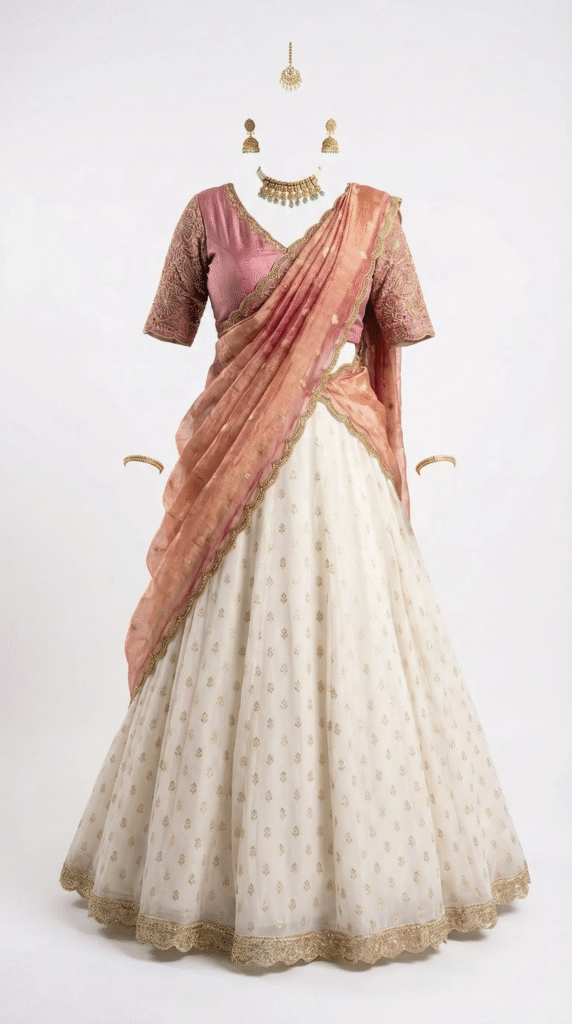 The Dusty Rose and Ivory Half-Saree. A mauve pink silk blouse with heavy gold embroidery on the sleeves, paired with an ivory georgette skirt featuring gold motifs. A sheer peach/rose organza dupatta with a scalloped border.